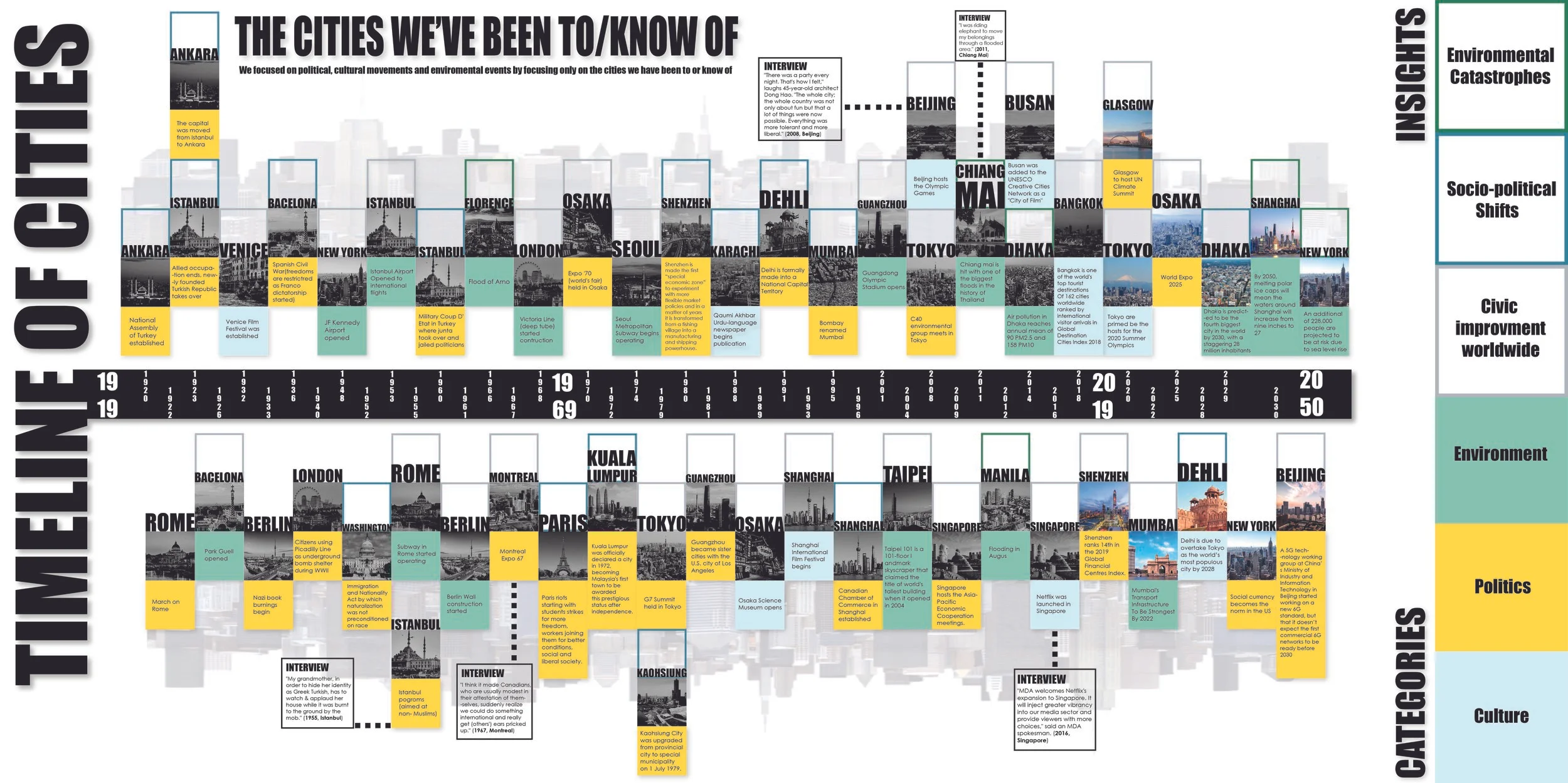 This is the first phase of an interactive system project, and the theme would be “city of experience”. I was required to create a visual timeline for the city of experiences that both looks back 100 years and forward 100 years. The goal is to blend primary (the quality of possible interviews, surveys, and observations) and secondary (the quality and collection of past and future facts) research methods to create a visual timeline that illustrates the different patterns and relationships of experiences found in the city. This timeline will act as a guide or a map as we move forward into concept development and later interactive system development.