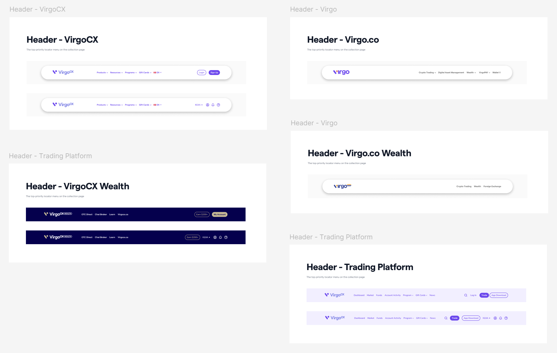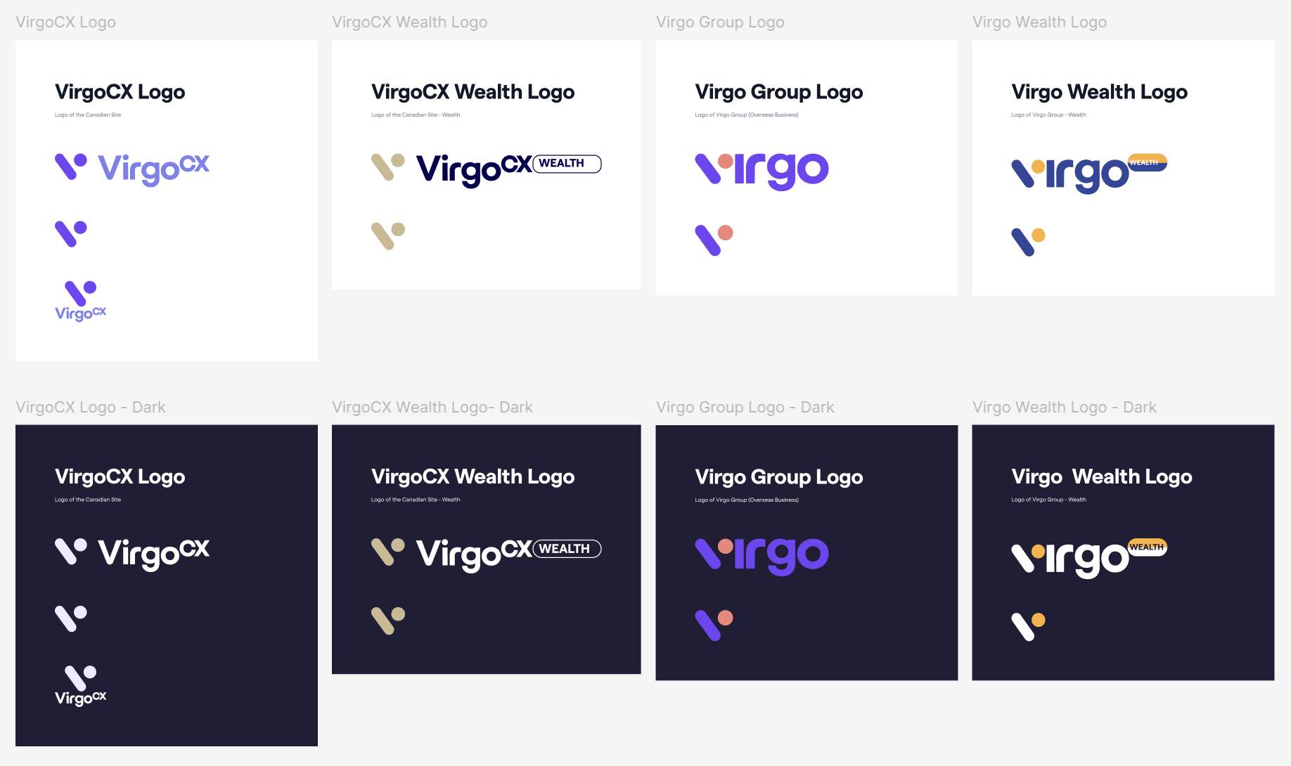 The original logos, “VirgoCX” and “VirgoCX Wealth,” along with their variations, were documented in the design system. As the company expanded into Australia and the UK under the parenting company Virgo Group, so new logos for Virgo and Virgo Wealth were collaboratively developed with stakeholders, including color selections for both light and dark backgrounds. All logos were then systematically documented in the design system.