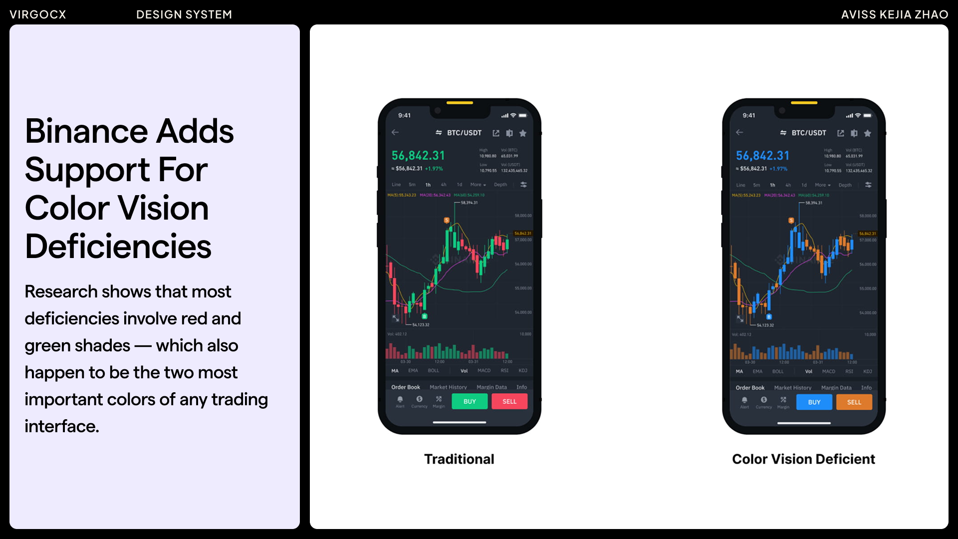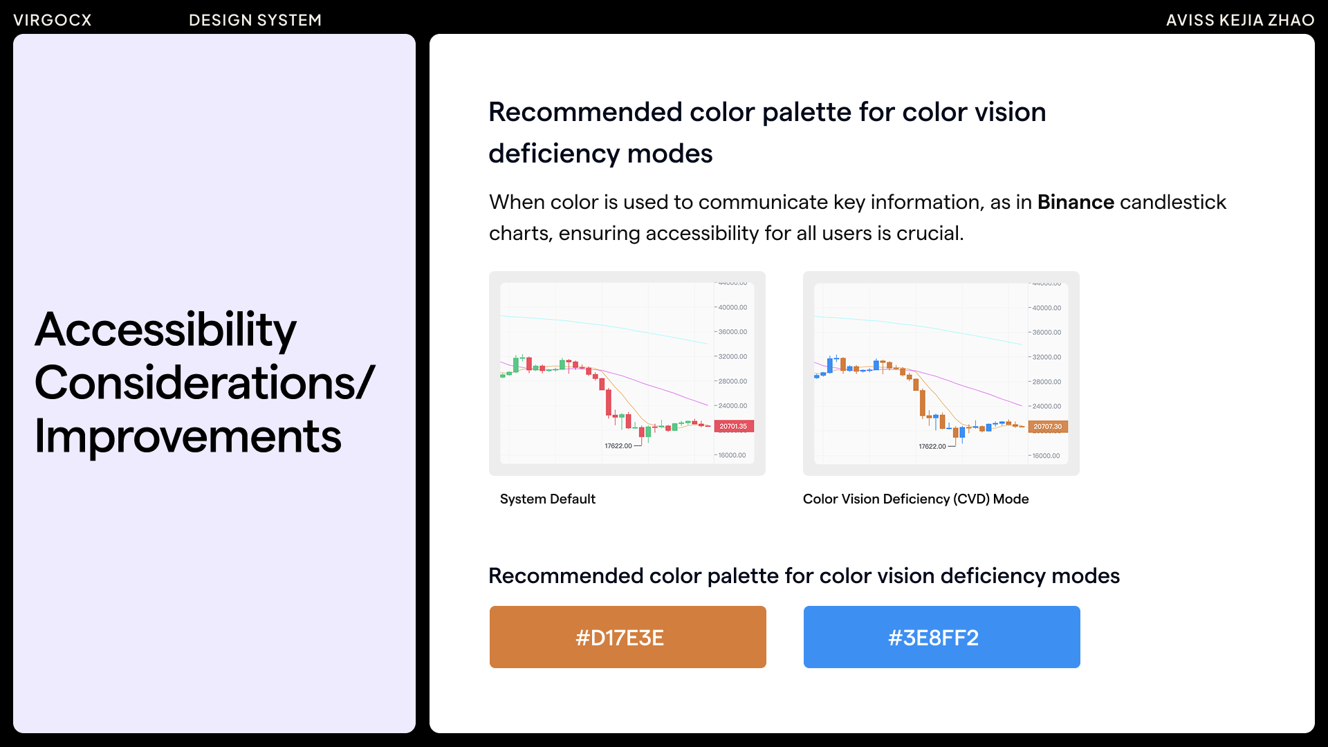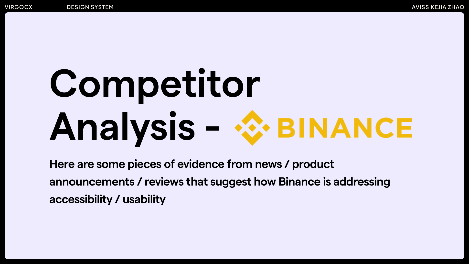 In my competitor analysis of Binance, I noted that their recent UI Refined update introduced improvements such as enhanced typography, dark mode, and customizable layout widgets, all of which support better readability and usability. They also included features addressing color vision deficiencies, an important consideration in trading platforms where red and green play a critical role. However, I found no clear evidence of full WCAG compliance, such as robust keyboard-only navigation or detailed accessibility support for screen readers. Drawing from these observations, I prioritized accessibility in the VirgoCX design system by focusing on readability (through font size and contrast), responsive design, and consideration of color vision deficiency modes —helping to fill these gaps and future-proof the product for a diverse range of users.