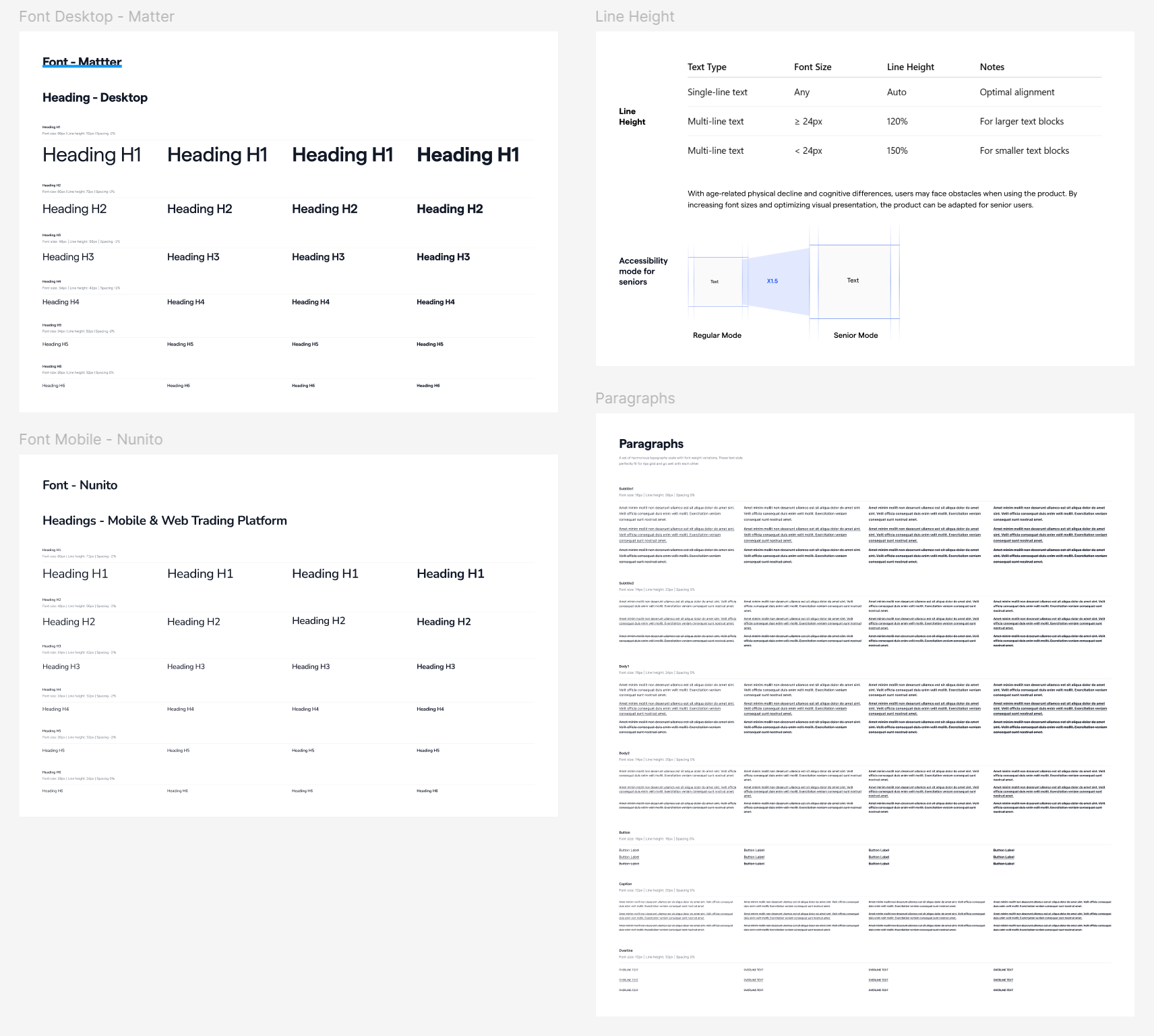 Typography was another key part of organizing the design system. To align with brand identity and platform needs, the Matter font family was chosen for the website, providing a clean and professional look, while the Nunito font family was applied across the mobile app and trading platform for its readability and friendly tone.