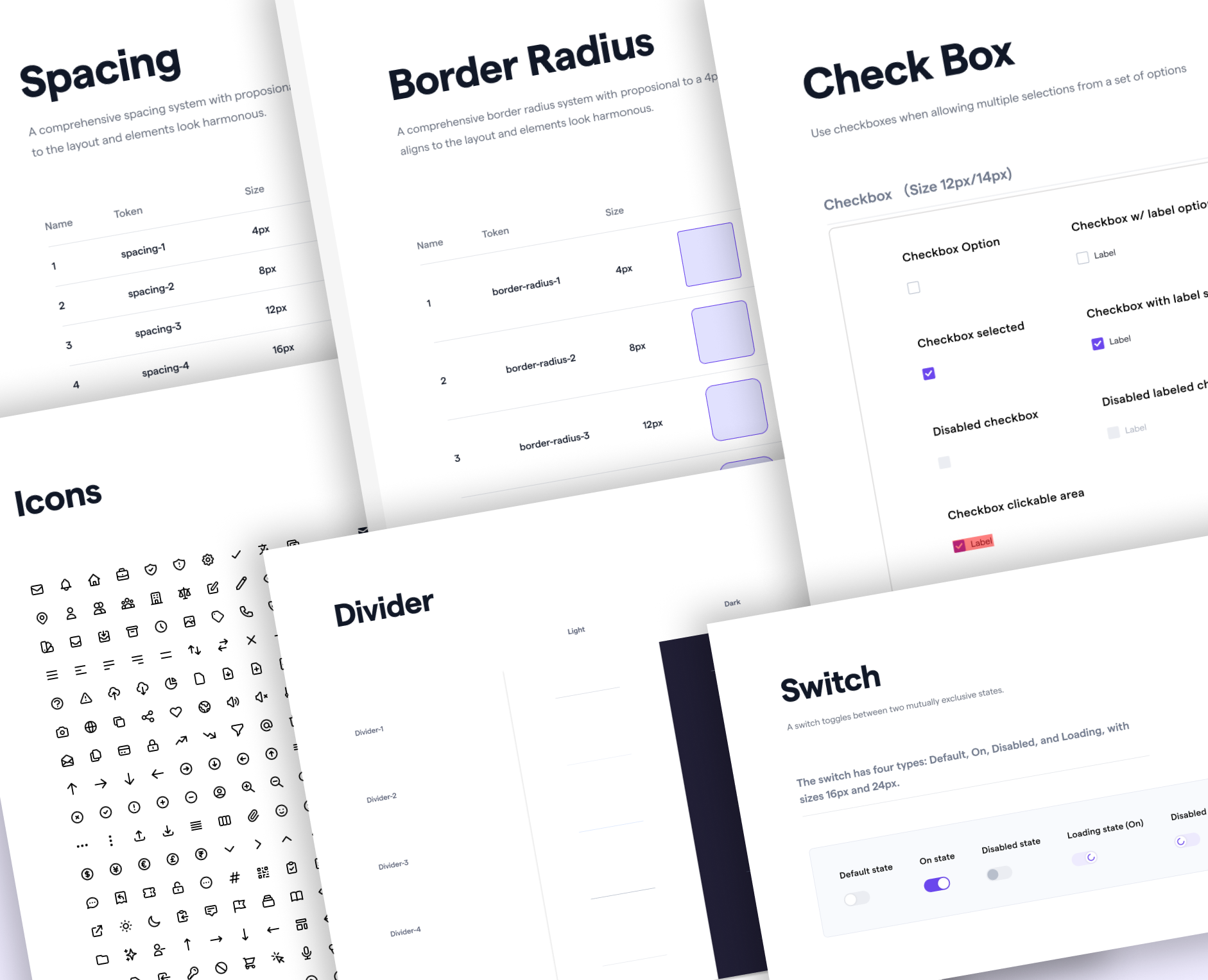 Other components in the design system include spacing, border radius, typography, color palette, checkbox, divider, switch, dropdown menu, input fields, and card layouts and more. This design system is not a finished product but rather a foundation that continues to evolve. It is built to grow with the company’s products, allowing more components and standardized elements to be documented and added over time, ensuring visual consistency, development efficiency, and scalability across platforms.