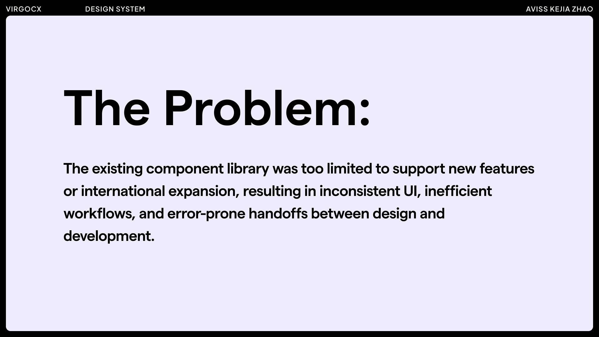 When I first joined VirgoCX, the team lacked a proper design system, which resulted in inconsistencies across products. I initiated and collaborated with the design lead to build a scalable design system from the ground up. This process included conducting a UI audit to identify existing patterns, consolidating reusable components, and defining naming conventions, states, and interaction behaviors. I also established guidelines for typography, color, spacing, and accessibility, and partnered with developers to ensure seamless implementation.
