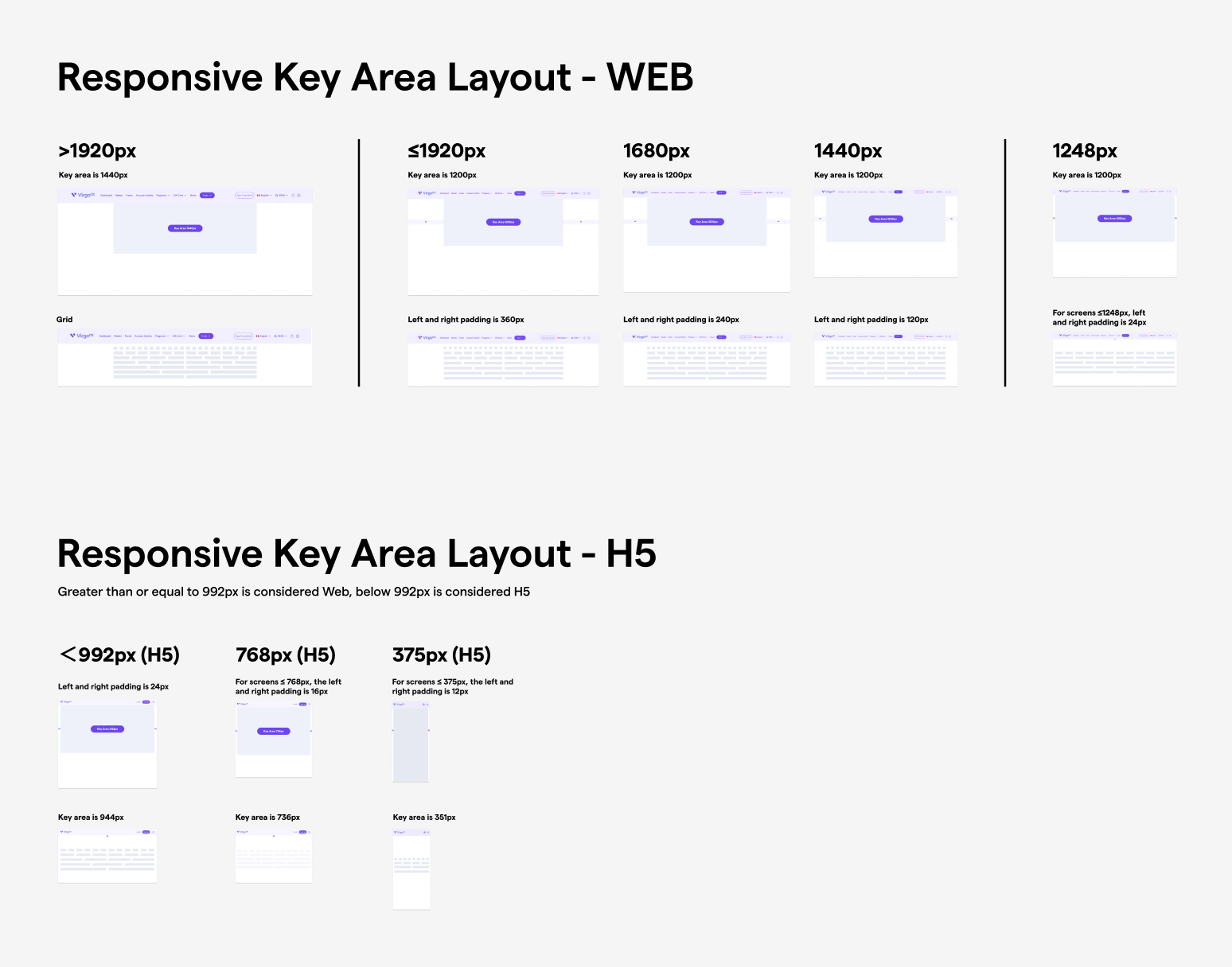 In this design system, a responsive key area layout was established for Web and H5 platforms to maintain consistent spacing and alignment across screen sizes. For Web (≥1248px), the key area spans 1200–1440px with 24–360px horizontal padding, while H5 (<992px) adopts a mobile-first approach, scaling the key area from 944px to 351px with 24–12px padding. This approach ensures visually balanced, user-friendly content and provides clear guidelines for responsive layout implementation.