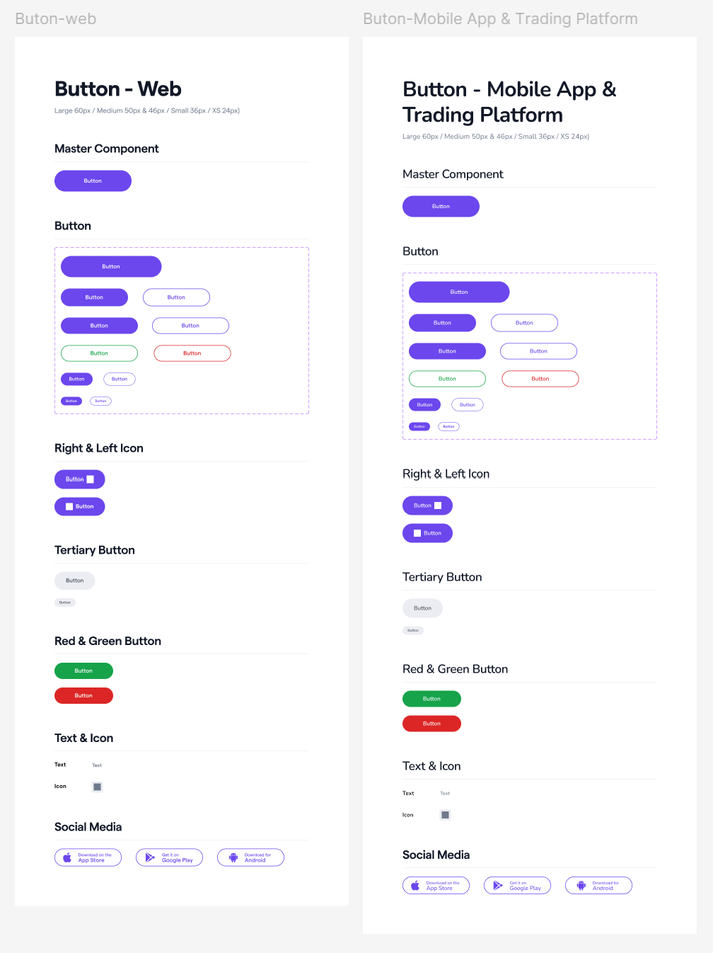 Buttons were not consistently organized, making it necessary to establish proper guidelines for their usage. Standardized sizes were defined (e.g., large 60px, medium 50px, small 36px), along with corresponding heights for each variation. Since two different typographic systems were being used for web, mobile, and the trading platform, it became essential to separate button styles and create clear guidance on when and how to apply them.