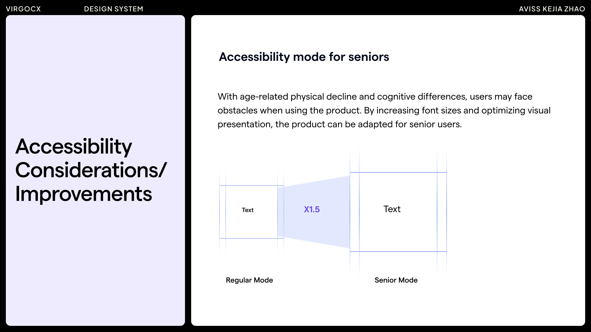 Based on research and competitor analysis, key accessibility considerations were identified for the design system. These included ensuring adequate color contrast, recommending color palettes suitable for color vision deficiency modes, and implementing a mode tailored for seniors, etc. all aimed at creating a more inclusive and user-friendly system. Accessibility is an ongoing effort, and there is always room to further incorporate improvements in the future.