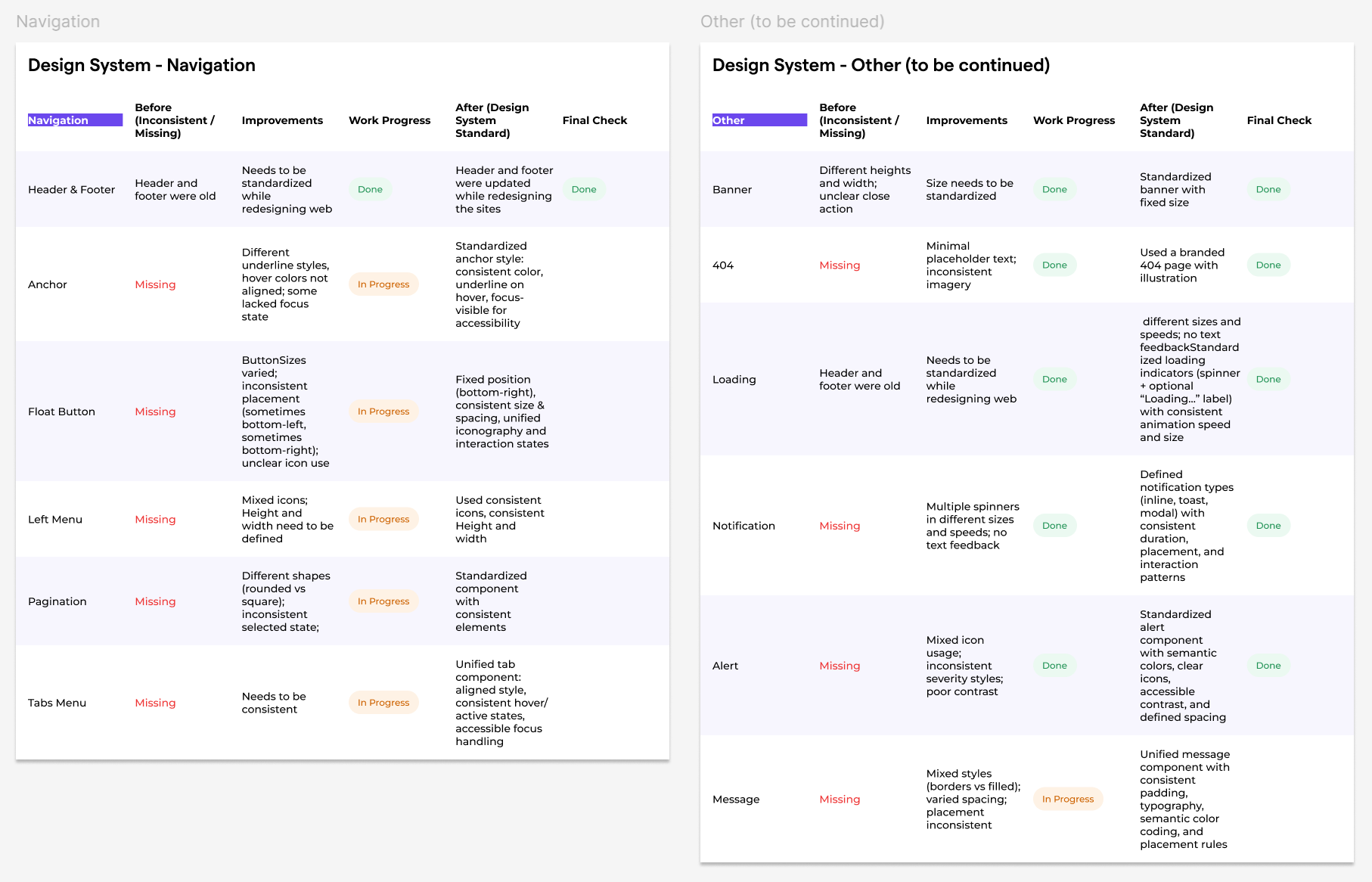 To ensure consistency across the design system, I created a comprehensive table as a work guidance tool. It captured the initial state of each component, identified required improvements, documented the standardized redesign, and included a final quality and accessibility review. This approach not only ensured every element was systematically evaluated and aligned with design standards but also provided a clear foundation for new team members to onboard efficiently. Designed as a living reference, the table continues to guide ongoing updates and supports the future growth of the design system.